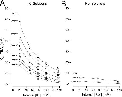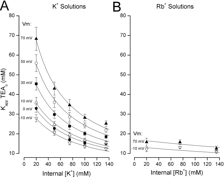 Figure 3. . Sensitivity of apparent affinity for external TEA block to internal K+ and Rb+. (A) Internal K+ dependence of Kapp for TEA block at the indicated membrane potentials. Lines are fits of Eq. 4 to the data with parameters as described in text. Data at 0 mV (•) from Thompson and Begenisich (2001). (B) Internal Rb+ dependence of Kapp for TEA block at the indicated membrane potentials. Lines are simulations from Eq. 4 with parameters as described in text.