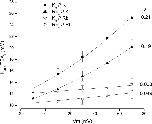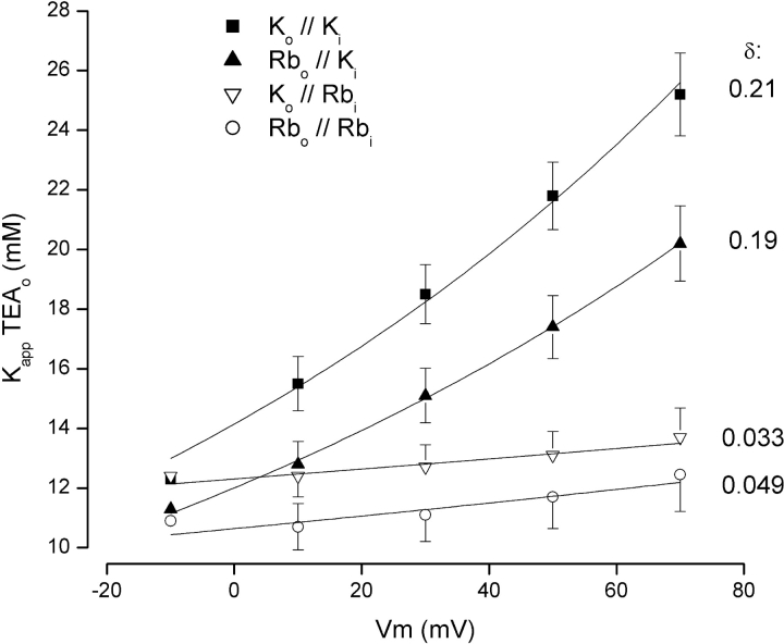 Figure 2. . Voltage dependence of TEA block in K+ and Rb+ solutions. The apparent Kd for external TEA block, Kapp, is shown as a function of membrane potential for solutions containing K+ on both sides of the channel (▪), solutions with external and internal Rb+ (○), external Rb+ and internal K+ (▴), and external K+ with internal Rb+ (▿). Lines are fits of Eq. 2 to the data with the indicated value of δ.
