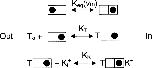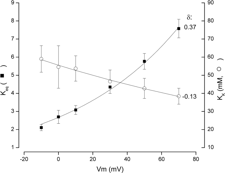 Figure 4. . Voltage dependence of the selectivity filter effective K+ equilibrium, Keq, and the inner vestibule K+ site affinity, KK. The Keq (▪) and KK (○) data were obtained as described in text. The lines are fits of Eq. 2 to the data. The electrical distance parameter, δ, for the selectivity filter equilibrium is 0.37, measured from the external side. The electrical distance for the vestibule site is 0.13 into the membrane electric field from the inner side, indicated by the minus sign. Other parameters from the fit are described in the text.