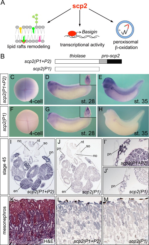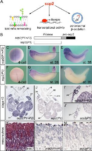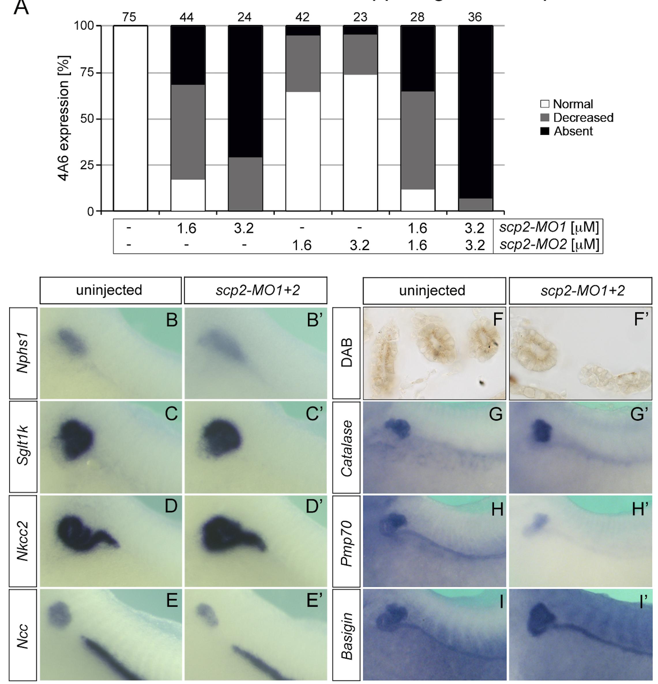 Supplementary Fig. S7.Scp2 Morphant Phenotype. (A) Quantification of the whole mount immunostainings with 4A6 shown in Fig. 3K N. The embryos were categorized in three groups representing increasing severity of the phenotype. The amount of MOs injected and the number of embryos analyzed is indicated. (B-E׳) Whole mount in situ hybridization of uninjected and scp2-MO1+2-injected embryos for Nphs1 (B,B׳), Sglt1k (C,C׳), Nkcc2 (D,D׳) and Ncc (E,E׳) at stage 39. (FâH׳) Uninjected controls and scp2-MO1+2-injected embryos were stained with DAB to visualize endogenous peroxidase activity at stage 40 (F,F׳) and by whole mount in situ hybridization using the peroxisomal marker genes, Catalase (G,G׳) and Pmp70 (H,H׳) at stage 39. (I,I׳) Basigin whole mount in situ hybridization of uninjected controls and scp2 morphants at stage 39.