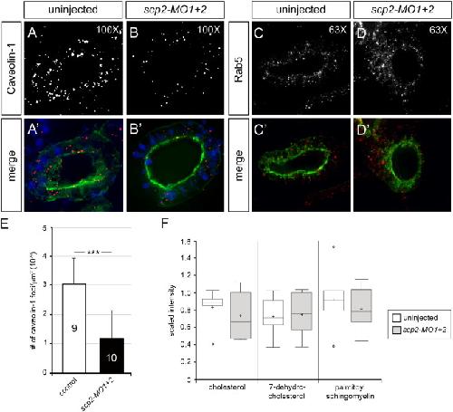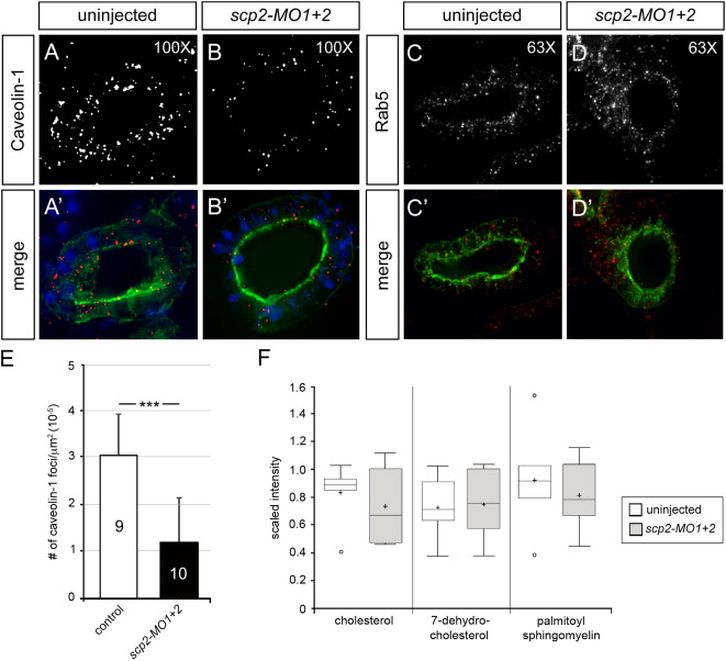 Fig. 4. Scp2 and Lipid Rafts. (AâD׳) Immunofluorescence analysis of uninjected controls and scp2-MO1+2-injected embryos at stage 40 using Caveolin-1 (AâB׳) or Rab5 (CâD׳) antibodies with the gray-scale image showing Caveolin-1 or Rab5 staining alone and the color panels showing merged images. ECL was used to identify proximal tubules (green), DAPI (blue) to visualize nuclei. (E) Quantification of the number of Caveolin-1-positive foci identified in (A,B). The number of embryos analyzed is indicated in the individual bars. Data were analyzed by Student׳s t-Test and the three asterisks indicate a significance of p<0.001. (F) Metabolomics analysis of uninjected and scp2-MO1+2-injected embryos at stage 38 showing Box-and-Whisker Plots for cholesterol, 7-dehydrocholesterol and palmitoyl sphingomyelin.