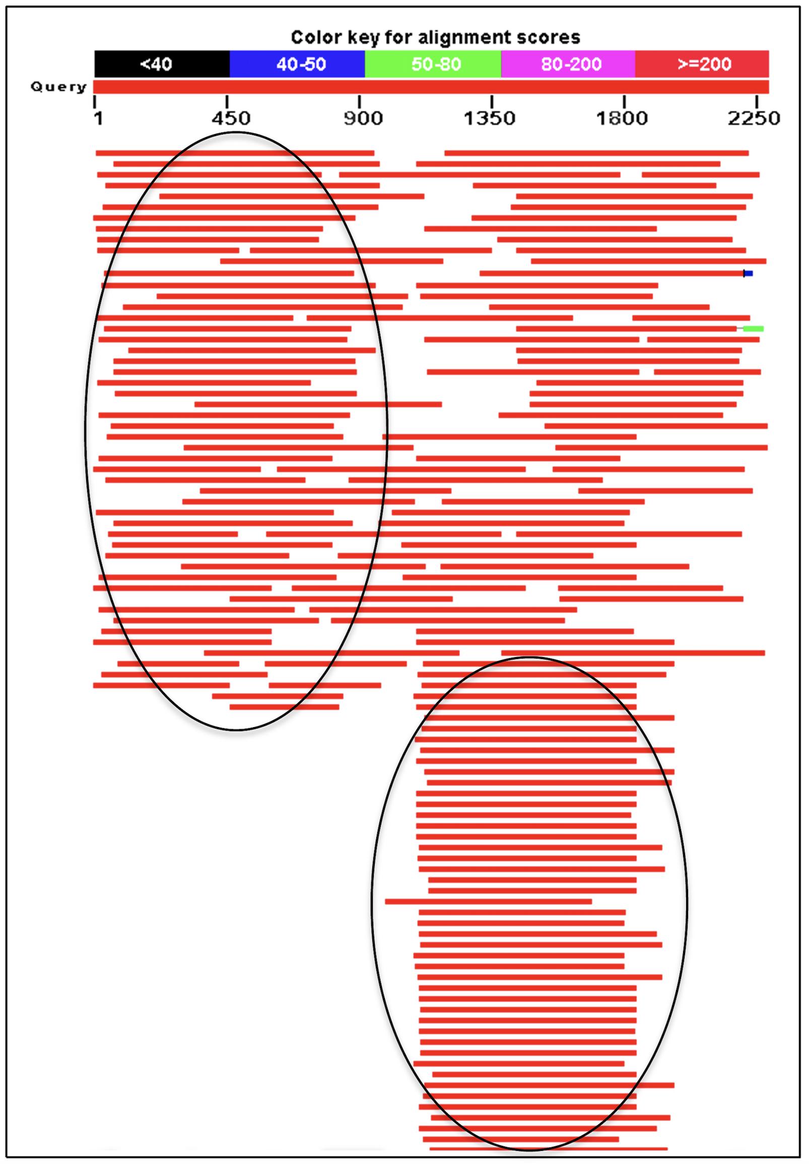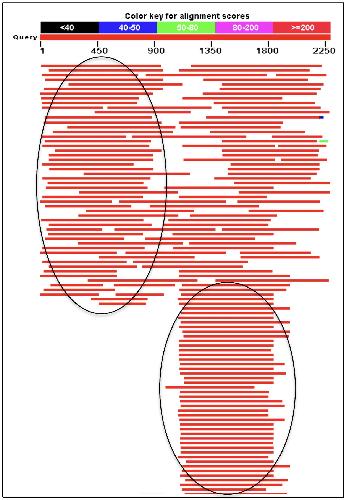Supplementary Fig. S6. EST Profile of Xenopus laevis scp2. Snapshot of a BLAST-N search with scp2 using all available Xenopus laevis ESTs. Circled areas indicate reads that correspond to transcripts from promoter 1 and promoter 2, respectively.