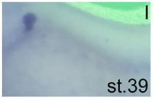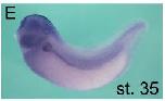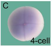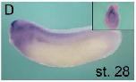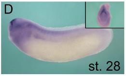 Supplementary Fig. S9. Expression of Basigin during Xenopus Development. Whole mount in situ hybridization of Xenopus embryos at 4-cell stage and stages 17, 28 and 39 using a Basigin antisense RNA probe. Red arrowheads in (C) indicate earliest expression of Basigin in the pronephric kidney.