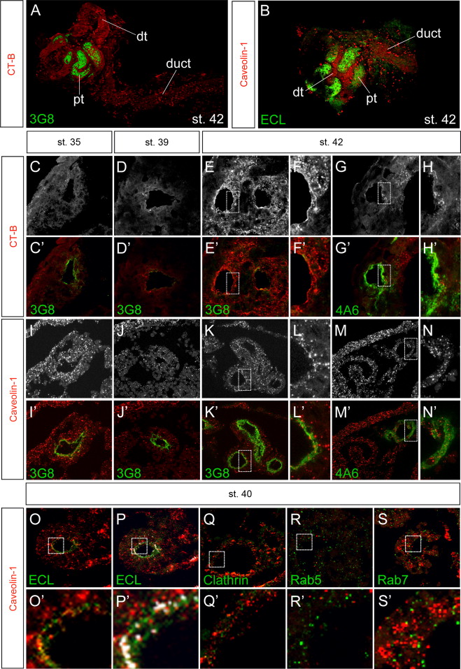 Fig. 1. Lipid Rafts in the Pronephric Kidney. (A,B) Whole mount immunostaining of Xenopus pronephroi using the B-subunit of Cholera Toxin (CT-B) or an antibody against Caveolin-1 at stage 42. Proximal tubules were counterstained using the 3G8 antibody (A) or ECL (B). pt, proximal tubules; dt, distal tubules. (CâH׳) Cryostat sections of stage 35, 39 and 42 Xenopus embryos stained with CT-B and either 3G8 (CâF׳) or 4A6 (GâH׳). (IâN׳) Paraplast sections of stage 35, 39 and 42 Xenopus embryos stained with Caveolin-1 and 3G8 (IâL׳) or 4A6 antibodies (MâN׳). The gray-scale panels show CTâB and Caveolin-1 staining only, while the color panels show the merged images. (OâS׳) Paraplast sections of stage 40 Xenopus embryos stained with anti-Caveolin-1 in combination with ECL (OâP׳), Clathrin (Q,Q׳), Rab5 (R,R׳) and Rab7 (S,S׳). In panel P and P׳ co-localization of Caveolin-1 and ECL staining in the apical domain was analyzed using the co-localization module of the LAS AF software and is indicated by white pixels. The panels F,F׳,H,H׳,L,L׳,N,N׳,O׳,P׳,Q׳,R׳ and S׳ are close-ups of the areas indicated by the white boxes.