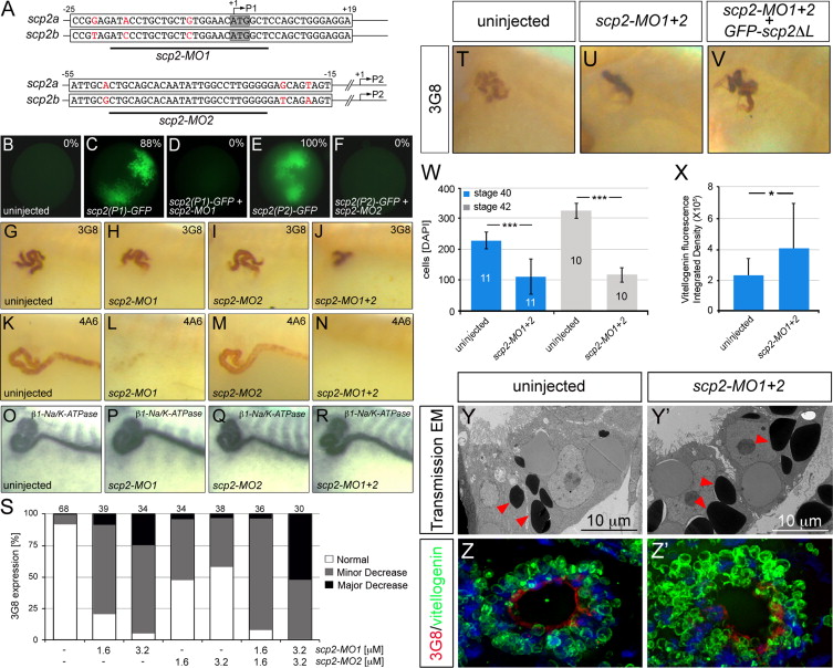 Fig. 3. Phenotype of Xenopus Embryos Lacking Scp2. (A) Sequence alignment of the two scp2 pseudo-alleles in the regions targeted by either scp2-MO1 or scp2-MO2. The position of the MOs and the start codons (P1 and P2) are indicated. Non-conserved nucleotides are highlighted in red. (BâF) Xenopus embryos were injected animally with the scp2-MO1 and scp2-MO2 at the 2-4 cell stage followed by two diametral injections of synthetic mRNA encoding either scp2(P1)âGFP or scp2(P2)âGFP at the 8-cell stage, while control embryos were only injected with the scp2(P1)âGFP or scp2(P2)âGFP mRNA. Embryos were analyzed at stage 10.5 by florescence microscopy. Representative images are shown and the percentage of GFP-positive embryos is indicated in the upper right corner of each panel. (G-R) 3G8 or 4A6 immunostaining at stage 40 (GâN) or β1-Na/K-ATPase whole mount in situ hybridization at stage 39 (O-R) of Xenopus embryos injected with scp2-MO1, scp2-MO2 or a combination of both MOs (scp2-MO1+2). (S) Quantification of the 3G8 whole mount immunostaining. The embryos were categorized in three groups representing increasing severity of the phenotype. The amount of MOs injected and the number of embryos analyzed is indicated. (TâV) 3G8 immunostaining of stage 40 controls or embryos injected with scp2-MO1+2 in the presence or absence of GFP-scp2δL DNA. Panels show representative images of four independent experiments. (W) Bar diagram of the number of proximal tubular cells in embryos injected on one side with scp2-MO1+2 and comparing the injected and uninjected side at stages 40 and 42. The number of embryos analyzed is indicated in the individual bars. Data were analyzed by paired Studentâ²s t-Test; the three asterisks indicate a significance of p<0.001. (X) Bar diagram of the measured intensity of the vitellogenin immunostainings (see panel Z, Z׳). Data were analyzed by Student׳s t-Test and asterisk represent a significance of p<0.05. (YâZ׳) Uninjected and scp2-MO1+2-injected embryos at stage 40 were analyzed by transmission electron microscopy (Y,Y׳) or immunofluorescence staining of proximal tubules using 3G8 (red) and anti-vitellogenin antibodies (green) (Z,Z׳). Nuclei were counterstained with DAPI. Red arrowheads in (Y,Y׳) indicate individual electron-dense yolk platelets.