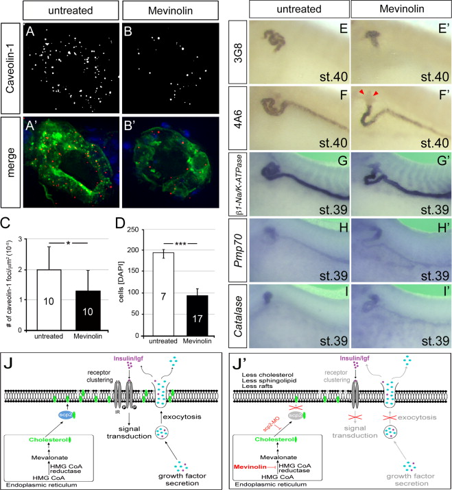 Fig. 5. Proximal Tubule Phenotype upon Inhibition of Cholesterol Synthesis. (AâB׳) Immunofluorescence analysis of untreated controls and embryos treated with 125 μM Mevinolin at stage 40 using anti-Caveolin-1 (red) antibody and ECL (green) with the gray-scale image showing Caveolin-1 staining alone and the color panels showing merged images. DAPI (blue) was used to visualize nuclei. (C) Quantification of the number of Caveolin-1-positive foci identified in (A,B). The number of embryos analyzed is indicated in the individual bars. Data were analyzed by Student׳s t-Test and asterisk represent a significance of p<0.05. (D) Bar diagram of the number of proximal tubular cells in untreated controls and Mevinolin-treated embryos at stages 40. The number of embryos analyzed is indicated in the individual bars. Data were analyzed by Student׳s t-Test and the three asterisks indicate a significance of p<0.001. (EâI׳) Untreated controls and Mevinolin-treated embryos were processed for 3G8 and 4A6 immunohistochemistry at stage 40 (EâF׳) or whole mount in situ hybridization with β1-Na/K ATPase (G,G׳), Pmp70 (H,H׳) and Catalase (I,I׳) at stage 39. (J,J׳) Model for the role of lipid rafts in proximal tubule elongation in the wild-type situation (J) or in the absence of scp2 or upon treatment with Mevinolin (J׳). See discussion for details.