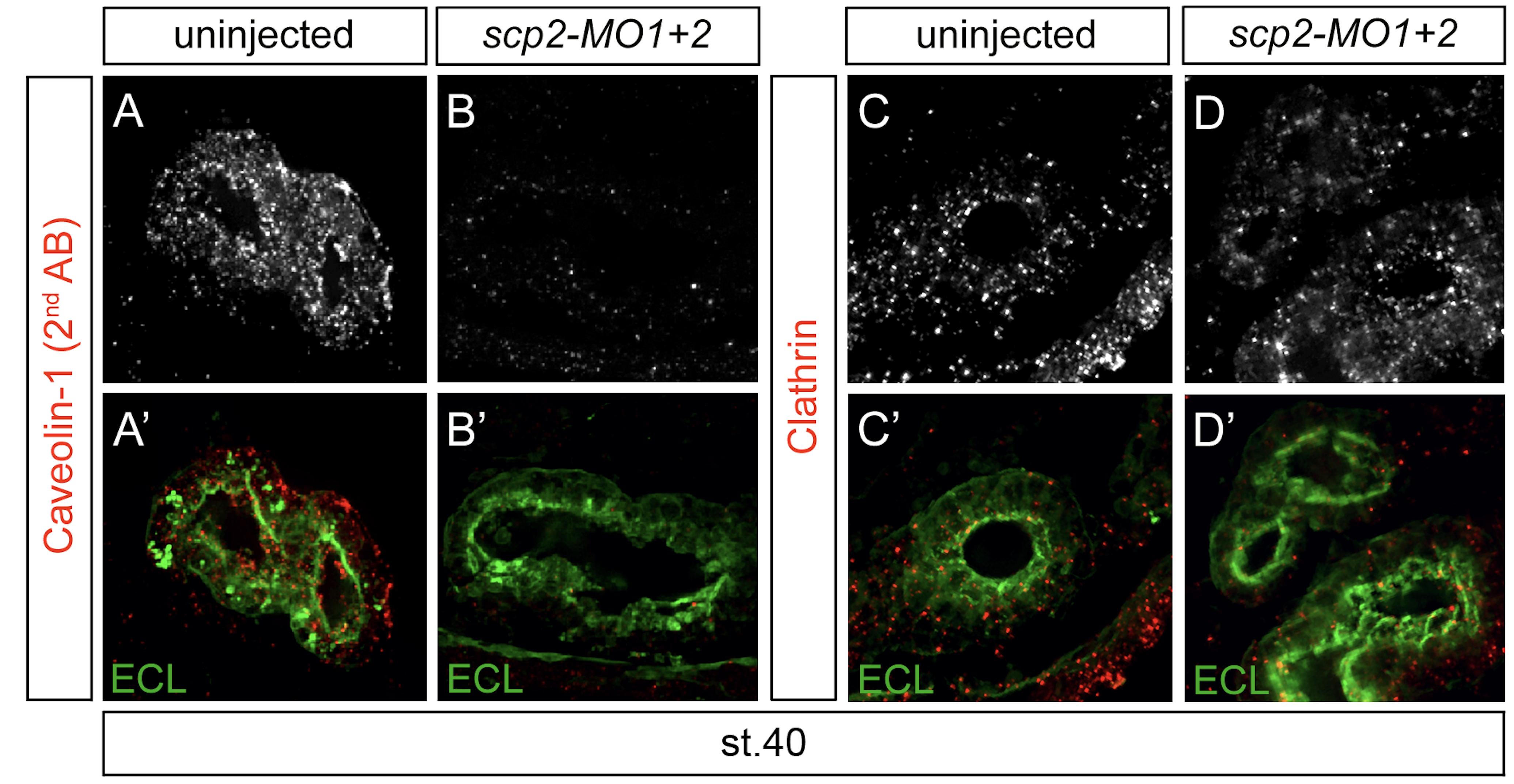 Supplementary Fig. S1. Scp2 and Lipid Rafts. (AâD׳) Immunofluorescence analysis of uninjected controls and scp2-MO1+2-injected embryos at stage 40 using a second anti-Caveolin-1 antibody (AâB׳, #3267, Cell Signaling) or anti-Clathrin (CâD׳). Gray-scale image show Caveolin-1 or Clathrin staining alone and the color panels depict the merged images. ECL was used to identify proximal tubules (green).