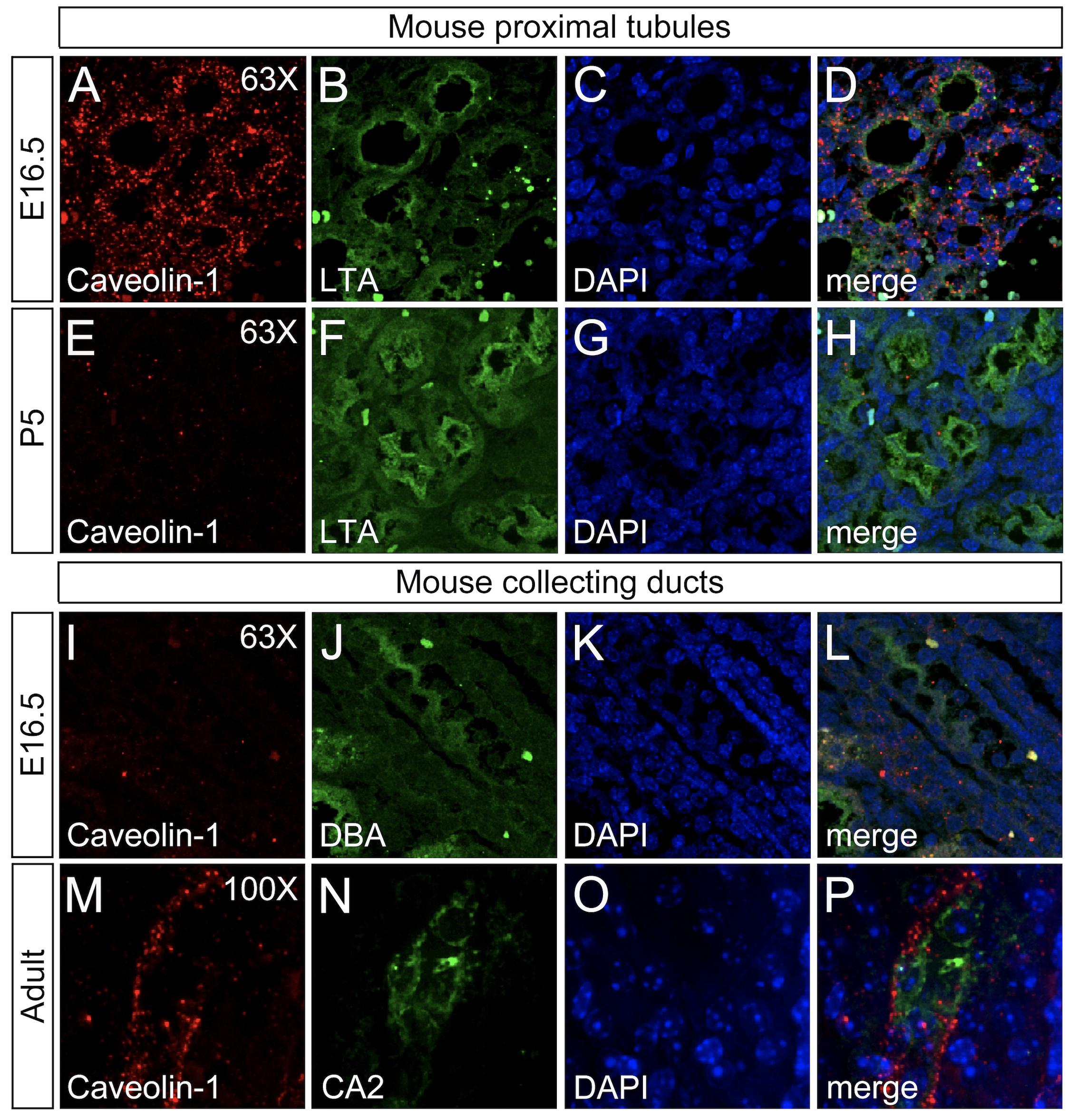 Supplementary Fig. S2. Caveolin-1 Localization in Mouse Kidneys. Immunofluorescence analysis of mouse metanephric kidneys at three different stages (E16.5, P5 and adult) using anti-Caveolin-1. Proximal tubules (A–H) were identified by LTA staining, collecting ducts (I-P) were marked by either DBA (I-L) or Carbonic Anhydrase 2 (CA2) staining (M–P). DAPI (blue) was used to visualize nuclei.
