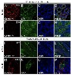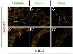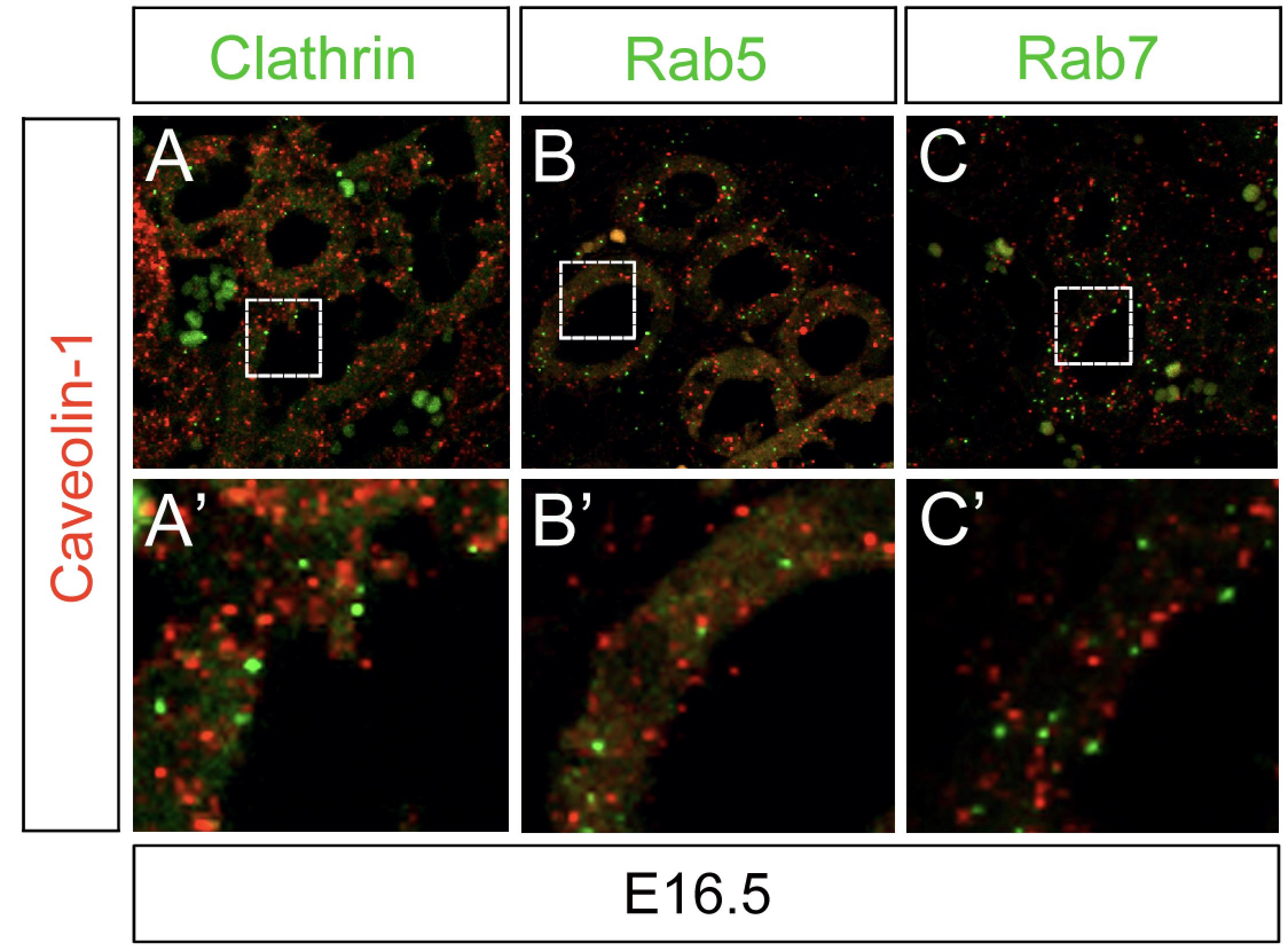 Supplementary Fig. S3. Caveolin and the Endocytic Compartments in Mouse. Paraplast sections of E16.5 mouse kidneys were stained with anti-Caveolin-1 (red) in combination with Clathrin (A,A׳), Rab5 (B,B׳) and Rab7 (C,C׳) in green.