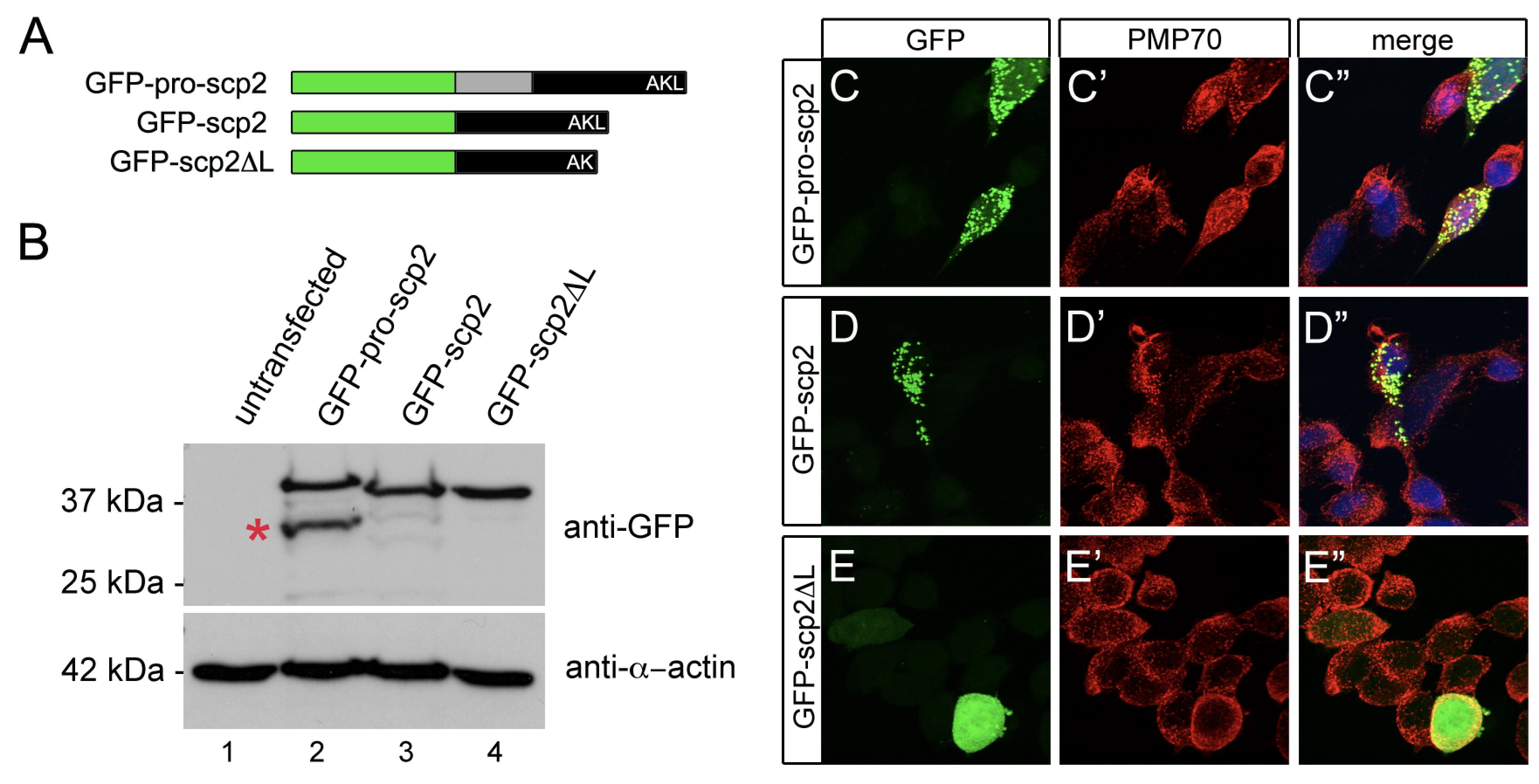 Supplementary Fig. S5.Xenopus Scp2 is a Peroxisomal and Cytoplasmic Protein. (A) Schematic of N-terminal GFP fusion proteins with different scp2 variants. (B) Constructs shown in (A) were transfected into HEK-293T cells and processed for Western Blot using an anti-GFP and anti α-actin antibody as loading control. Asterisk indicates the cleavage product of GFP-pro-scp2 that lacks scp2 itself. (C-E”) Immunofluorescence analysis of the cells transfected with the three scp2 variants and co-stained with an anti-PMP70-antibody (red) to visualize the peroxisomes. Nuclei were counterstained using DAPI (blue).