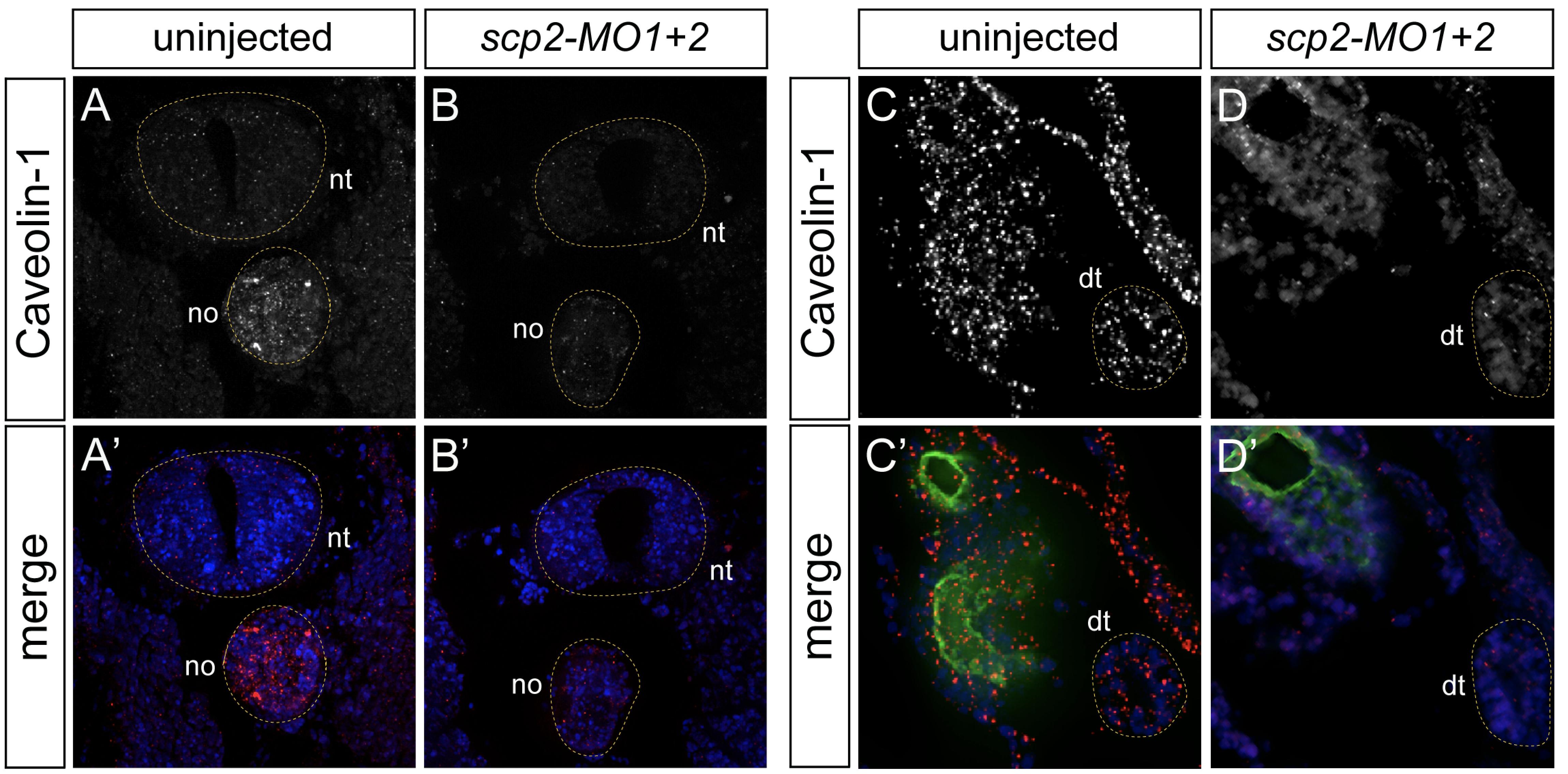 Supplementary Fig. S8. Scp2 Knockdown Effects on Lipid Rafts. (AâD׳) Caveolin-1 immunofluorescence analysis of uninjected controls and scp2-MO1+2-injected embryos at stage 40; neural tube (nt) and notochord (no) (AâB׳) as well as the kidney (CâD׳) were analyzed. Gray-scale image show Caveolin-1 staining alone and the color panels depict the merged images. 3G8 antibody staining (green) was used to identify proximal tubules in (CâD׳), DAPI (blue) to visualize nuclei. Note that scp2 morphants show reduced Caveolin-1 staining not only in the proximal tubules, but also in the notochord, the neural tube and the distal tubules (dt). All the structures are indicated by yellow outlines.