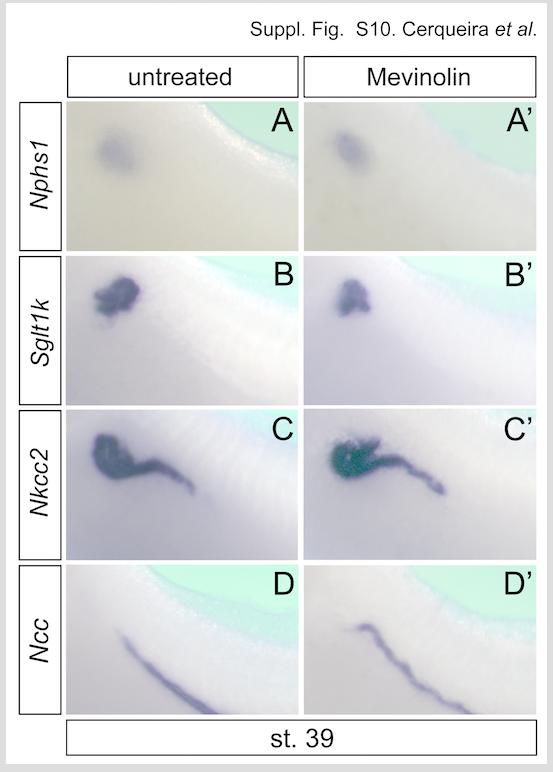 Supplementary Fig. S10. Pronephric Patterning in Xenopus Embryos Treated with Mevinolin. Whole mount in situ hybridization of untreated controls and embryos treated with 125 ïM Mevinolin for Nphs1 (A,A׳), Sglt1k (B,B׳), Nkcc2 (C,C׳) and Ncc (D,D׳) at stage 39.