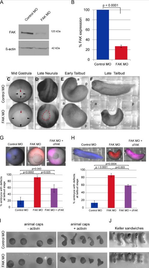 Fig. 1. FAK knockdown inhibits gastrulation movements and axial elongation. (A) Representative Western blot of FAK expression levels in stage 11 embryos injected at one or two cell stage with Control or FAK morpholino (MO), β-actin was used as a loading control. (B) Quantification of FAK protein levels in stage 11 embryos, normalized to β-actin and shown relative to control embryos (N=10). Data are mean±SEM. (CâF) Time matched views of representative Control and FAK MO injected embryos. (C) Vegetal view at mid gastrula (stage 11.5, arrowheads indicate blastopore lip, red arrowhead=dorsal). (D) Dorso-anterior view at late neurula (stage 22, red dashed line marks open neural tube). (E) Dorso-lateral view at early tailbud (stage 25). (F) Lateral view at late tailbud (stage 32). Stages given for control embryos, a=anterior, p=posterior. (G) Representative images and quantification of gastrulation phenotype (blastopore closure) in stage 12 Control and FAK MO injected embryos compared with embryos co-injected with FAK MO and cFAK (N=7, Control MO n=371, FAK MO n=513, FAK MO+cFAK RNA n=327). Embryos were counted as having defects if their development was more than 1 h behind that of control embryos, if there was failure to form or close the blastopore, or if the embryos died during gastrulation. The example given for âFAK MO+cFAKâ was counted as rescued (a mild phenotype and not included in count of embryos with defects). (H) Representative images and quantification of tailbud phenotype (axial elongation and formation of anterior structures) in stage 33 Control and FAK MO injected embryos compared with embryos co-injected with FAK MO and cFAK (N=4, Control MO n=225, FAK MO n=183, FAK MO+cFAK RNA n=217). Embryos were counted as having defects if they failed to form eye anlagen, had a distinctly shortened anteriorâposterior axis or failed to close the neural tube. The example given for âFAK MO+cFAKâ was counted as rescued (a mild phenotype and not included in count of embryos with defects). Data in G and H are mean±SEM. 25 ng MO injected per embryo. (I) Representative images from animal cap extension assay. Animal caps dissected from Control and FAK MO injected embryos with (+) and without (â) activin treatment (N=4, n=40/condition). (J) Representative images from Keller sandwich assay. Keller sandwiches made from Control and FAK MO injected embryos (N=3, n=15/condition). 20â25 ng MO and/or 200 pg RNA transcript injected per embryo. |