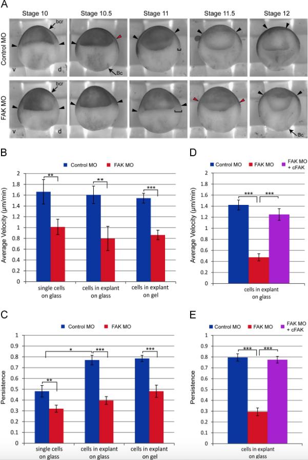 Fig. 2. FAK morphant mesendoderm cells migrate slowly and lack persistence. (A) Sagittal views of representative Control or FAK MO injected embryos from the same clutch that were fixed and bisected at time matched stages from early gastrulation (stage 10) through late gastrulation (stage 12). Arrowheads indicate position of the mesendoderm mantle, red arrowheads mark the first displacement between the mesendoderm and the blastocoel roof (bcr), red brackets mark the thickness of the marginal tissue, Bc=Brachet׳s cleft, d=dorsal, v=ventral. (B, C) Quantification of average velocity (B, displacement/time) and persistence (C, displacement/path length) of single mesendoderm cells on glass (N=3, Control MO n= 32, FAK MO n=65), cells in mesendoderm explants on glass (N=3, Control MO n=19, FAK MO n=23), and cells in mesendoderm explants on gels (N=3, Control MO n=22, FAK MO n=20). (D, E) Quantification of rescue of average velocity (D, displacement/time) and persistence (E, displacement/path length) of cells in mesendoderm explants on glass by co-injection of FAK MO with cFAK RNA (N=3, Control MO n=30, FAK MO n=32, FAK MO+cFAK RNA n=30). Data are mean ±SEM. âp<0.05, ââp<0.01, âââp<0.001. 20â25 ng MO and/or 200 pg RNA transcript injected per embryo. |