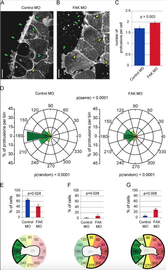 Fig. 3. FAK is essential for normal polarity of migrating mesendoderm. (A and B) Representative collapsed 5 µm z-stack images of live cells in control (A) and FAK morphant (B) mesendoderm explants expressing GAP-43-GFP to label membranes. Green arrowheads highlight protrusions in the expected direction of tissue movement and yellow arrowheads mark protrusions in any other direction. (C) Quantification of protrusions per cell in control and FAK morphant mesendoderm explants. Data are mean±SEM. (D) Quantification of protrusion angles of mesendoderm cells in explants from control (N=4, n=100) and FAK morphant (N=4, n=210) embryos, relative to cell centroids (center of rose diagram). 180° is defined as the predicted direction of normal tissue movement and marked in dark green. Mis-directed protrusions at 90° or 270° are marked in yellow and those at 0° are marked in red. Y axis for the rose diagrams represents percent of protrusions in each directional bin. Protrusions were quantified in both leading (row 1) and following (rows 2â4) cells. Significance was evaluated using circular statistical tests for randomness of distribution (Rayleigh׳s test, p(random)) and similarity of distribution (MardiaâWatsonâWheeler, p(same)). (EâG) Additional quantification of the data set shown in (D), indicating the percent of control or FAK morphant cells in mesendoderm explants with protrusions in the area defined in the cartoon beneath each graph, color coded to match graphs in (C). Data are mean±SEM. (E) Percent of cells with protrusions only within 45° of the direction of tissue migration. (F) Percent of cells with only protrusions deviating 75° or more from the direction of travel. (G) Percent of cells with at least one protrusion in the direction of travel and also one or more greater than 75° away from the expected direction of tissue migration. Scale bars=25 µm. 20â25 ng MO injected per embryo. |
