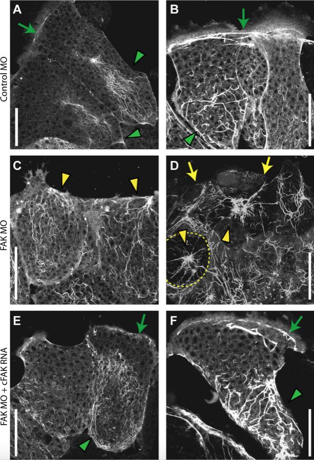 Fig. 5. FAK is required for organization of the keratin filament network. (AâF) Representative collapsed 10 µm z-stack images of live cells in mesendoderm explants expressing GFP-XCK1 (8) to label the keratin filament network. (A, B) Keratin filaments in leading edge cells in control explants. Green arrowheads indicate basket like arrangement of filaments in the rear of each cell, green arrows indicatecabling across the leading edge cells. (C, D) Keratin filaments in leading edge cells in FAK morphant explants. Yellow arrowheads indicate mis-localized filaments, yellow arrows indicate loss of cabling, yellow dashed line in (D) denotes cell outline. (E, F) Keratin filaments in leading edge cells in explants co-injected with FAK MO and cFAK RNA, which is not targeted by the morpholino. Green arrowheads indicate basket-like arrangement of filaments, green arrows indicate cabling across leading edge cells. Scale bars=50 µm. 20â25 ng MO injected per embryo. |