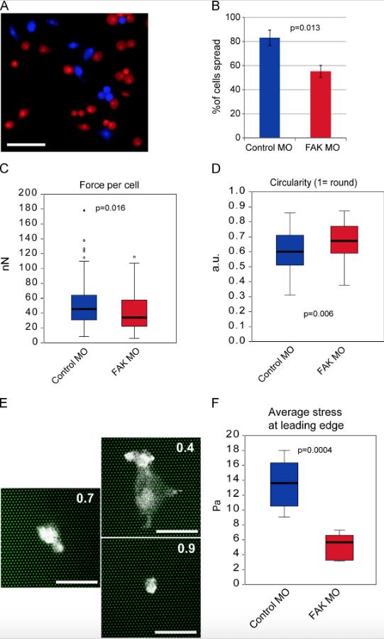 Fig. 6. Spreading and cell traction are reduced in FAK morphant mesendoderm cells. (A) Representative image of control (blue) and FAK morphant (red) mesendoderm cells plated on Fn coated coverglass. Cells labeled with fluorescently tagged dextran to show cell shape and mark control vs. FAK morphant cells. (B) Quantification of percent of mesendoderm cells spread on Fn coated coverglass (N=3, Control MO n=88, FAK MO n=97). Data are mean±SEM. (C) Quantification of average force per cell exerted by mesendoderm cells on Fn coated micropost arrays (N=4, Control MO n=74, FAK MO n=56). (D) Quantification of circularity of cells from (C). (E) Examples of cells from (D) illustrating the circularity values indicated in top right corner of each panel. Cells labeled with fluorescently tagged dextran to show cell shape, microposts are shown in green. (F) Quantification of average stress applied by leading edge cells of mesendoderm explants to Fn coated polyacrylamide gels (N=3, n=6 explants/condition). Data in (C, D, F) are shown in boxâwhisker plots, bold line indicates mean, box delimits 25thâ75th percentile and whiskers mark minimum and maximum values, statistical outliers are marked as dots. Scale bars=200 µm (A) or 50 µm (E). 25 ng MO injected per embryo. |