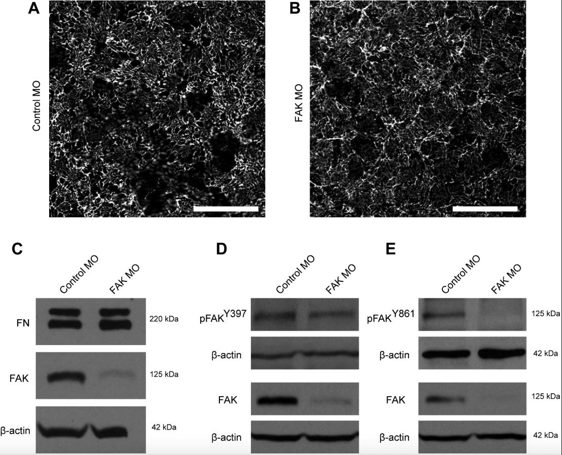 Supplementary Fig. S3. Fn expression and matrix assembly are not affected by loss of FAK expression. (A, B) Examples of single-plane structured-illumination images of fixed animal caps from stage 11 control (A) or FAK morphant (B) embryos, stained for Fn. (C) Western blot analysis of Fn expression in control and FAK morphant embryos at stage 11, blot was also probed with antibodies against FAK and β-actin to control for FAK knockdown and gel loading respectively. (D, E) Western blot analysis of levels of phosphorylation of FAK on tyrosine 397 (D) (N=4) or tyrosine 861 (E) (N=3) in control and FAK morphant embryos at stage 11, β-actin was used as a loading control. The same lysates were also blotted for FAK to control for FAK expression levels; β-actin was used as a loading control. Scale bars =100 µm. 20â25 ng MO injected per embryo. |