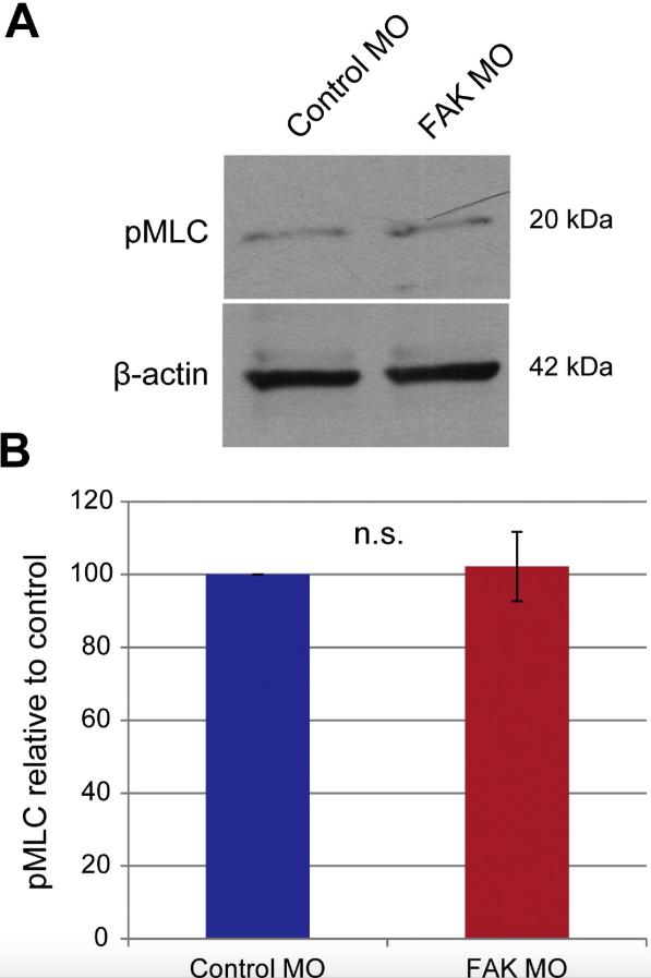 Supplementary Fig. S4. Phosphorylation of myosin light chain (MLC) is not altered in FAK morphant embryos. (A) Representative image of Western blot of whole embryo lysates from control and FAK morphant embryos at stage 11 probed with an antibody against pMLC, β-actin was used as a loading control. (B) Quantification of pMLC levels in control and FAK morphant embryos (N=3). Data are mean±SEM. 25 ng MO injected per embryo. |