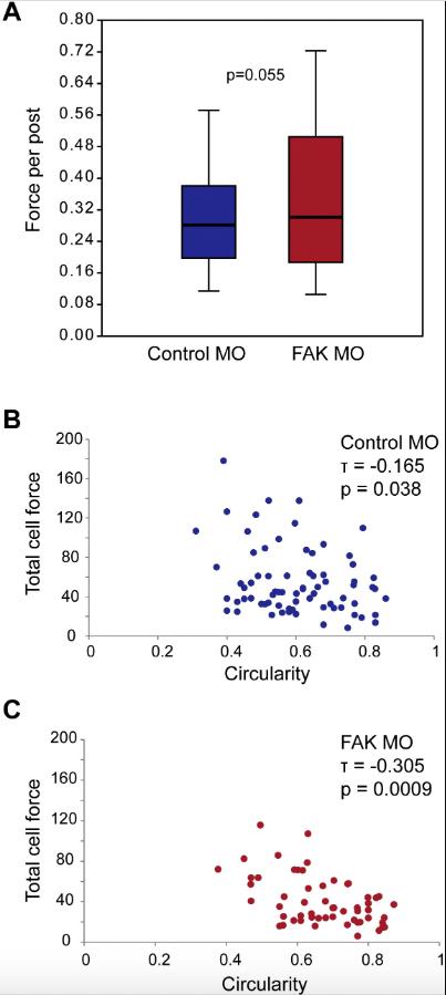 Supplementary Fig. S5. Knockdown of FAK does not significantly alter force per area but there is a significant correlation between decreased cell force and increased circularity. (A) Quantification of average force per micropost exerted by control and FAK morphant mesendoderm cells on Fn coated micropost arrays. Data are shown in boxâwhisker plots, bold line indicates mean, box delimits 25thâ75th percentile and whiskers mark minimum and maximum values (N=4, Control MO n=74, FAK MO n=56). (B, C) Scatter plots of total cell force (y-axis, see Fig. 6C) and circularity (x-axis, see Fig. 6D) of mesendoderm cells isolated from control (B) and FAK morphant (C) embryos and plated on Fn coated micropost arrays. Correlation was analyzed using Kendall׳s tau test, the test statistic (Ï) and p value are given. 25 ng MO injected per embryo. |