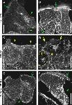 Fig. 4. Actin organization is altered in FAK morphant cells. (AâE) Representative confocal images of live cells in mesendoderm explants expressing GFPâmoesin to label the actin filament network. (A) Single plane confocal images of actin at the leading edges of cells in the first row (left) and following rows (right) of control mesendoderm explants. Green arrowheads indicate actin rich protrusions. (B) Single plane confocal images of actin on the leading edges of cells in the first row (left) and following rows (right) of FAK morphant mesendoderm explants. Yellow arrowheads indicate actin microspikes. (C) Collapsed 7.5 µm z-stack image of actin in a cell on the leading edge cell of a control explant. Greed arrowheads indicate cortical actin. (D) Collapsed 7.5 µm z-stack image of actin in a cell on the leading edge of a FAK morphant explant. Green arrowhead indicates cortical actin; yellow arrowheads indicate actin stress fibers. (E, F) Collapsed 5.5 µm z-stack images of cellâcell junctions in following rows of control (E) and FAK morphant (F) explants. Dashed lines mark the boundary between cells. (G) First frame from time-lapse confocal imaging of live cells in control mesendoderm explants (See Movie 1). Collapsed 5 µm z-stack image. Cells also labeled with fluorescently tagged dextran (blue) to show cell shape. (H) First frame from time-lapse confocal imaging of live cells in FAK morphant mesendoderm explants (See Movie 2). Collapsed 5 µm z-stack image. Cells also labeled with fluorescently tagged dextran (red) to show cell shape. Scale bars=10 µm (A, B, E) or 25 µm (C, D, G, H). 20â25 ng MO injected per embryo. |