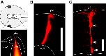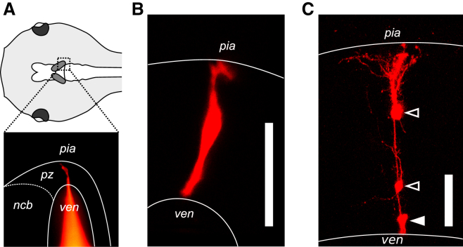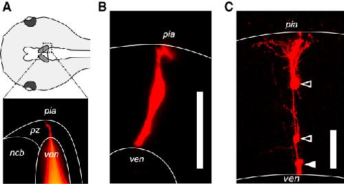 Figure 1. Lineage Tracing of Individual Tectal Progenitor Cells(A) Schematic dorsal view of a tadpole’s head (top) illustrating the positions of the two optic tecta (shaded); epifluorescence image (bottom) showing the electroporation of a single tectal progenitor cell with a fluorescently conjugated dextran (red). Region corresponds to dashed box above. ven, ventricle; pz, proliferative zone; ncb, neuronal cell bodies.(B) Two-photon image showing a single tectal progenitor cell captured 2 hr postelectroporation. The scale bar represents 50 μm.(C) Image of a tectal clone consisting of one radial progenitor cell (solid arrowhead) and two daughter neurons (open arrowheads), collected 10 days postelectroporation. The scale bar represents 50 μm.