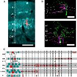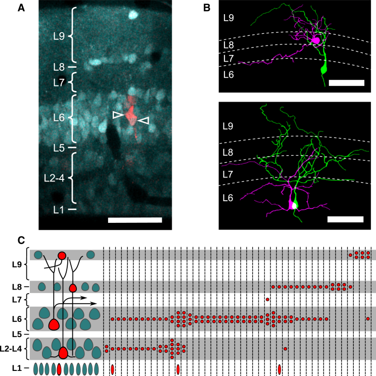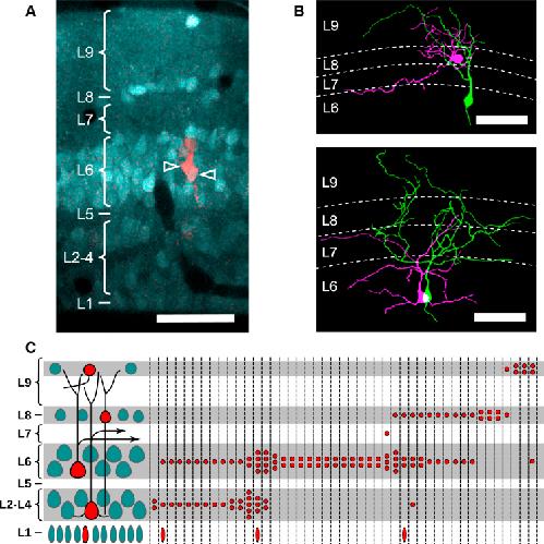 Figure 2. Morphology and Laminar Distribution of Tectal Sister Neurons(A) Two-photon image showing a pair of labeled sister neurons (red, open arrowheads) within a tectum loaded with OGB1-AM (cyan). The scale bar represents 50 μm. Boundaries of the nine tectal layers are annotated on the left.(B) Example morphological reconstructions of labeled sister neurons located in different tectal layers (top) and in the same tectal layer (bottom). Dotted white lines denote the positions of the layer boundaries, as determined from the OGB1-AM loading. Scale bars represent 50 μm.(C) Diagram showing the main tectal layers and cell types (left) and laminar fates of labeled sister neurons (right; n = 45 clones). Cell-dense layers are gray; neuropil layers are white. Red circles within each dashed column represent layer positions of daughter neurons generated by a single progenitor cell.