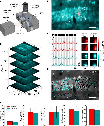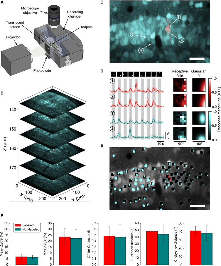 Figure 3. Two-Photon Calcium Imaging of Sister Neurons and Nearby Nonsister Neurons in the Optic Tectum(A) Experimental setup for in vivo calcium imaging and visual stimulation.(B) Two-photon stack through a region of tectum containing a single clone (red) and loaded with OGB1-AM (cyan). The z axis represents depth relative to the pial surface.(C) Single plane containing two dextran-labeled sister neurons. The scale bar represents 50 μm.(D) Example traces showing visually evoked calcium responses recorded from the neurons labeled in (C). Thin lines denote single trials; thick lines denote the mean response across trials. The corresponding visual stimuli are shown above. Raw spatial RFs and Gaussian fits corresponding to these neurons are also shown (right).(E) Fitted spatial RF maps obtained simultaneously from the two labeled sister neurons (red) and 83 nearby nonsister tectal neurons (cyan) shown in (C), superimposed onto their respective soma positions. The scale bar represents 50 μm.(F) Population data showing that clonally labeled tectal neurons do not differ from nonlabeled neurons in terms of their response magnitude (mean ÎF/F, p = 0.35; maximum ÎF/F, p = 0.31; n = 11 labeled neurons and n = 531 nonlabeled neurons; Mann-Whitney U test), their spatial selectivity (R2 values for Gaussian RF fits, p = 0.34), or the eccentricities of their RFs, as measured by either the euclidean (p = 0.16) or Chebyshev (p = 0.24) distance from the center of the stimulus area to the center of the fitted RF. Plots indicate mean ± SD.