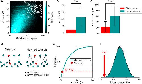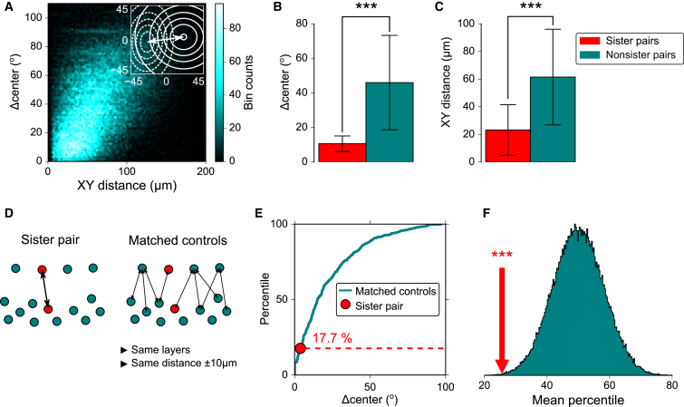 Figure 4. Sister Neurons in the Optic Tectum Have More Similar Spatial RFs Than Nonsisters(A) Relationship between spatial distance and Δcenter value for all pairs of tectal neurons (∗∗∗p < 0.001, ρ = 0.45, Spearman correlation). Inset illustrates how the Δcenter value was computed for a pair of RFs.(B) Δcenter values for sister and nonsister pairs of tectal neurons (data indicate mean ± SD; n = 13 clonal pairs and n = 72,546 nonclonal pairs from four animals in which a single clone was labeled; ∗∗∗p < 0.001, Mann-Whitney U test).(C) Spatial distances between somata of sister and nonsister pairs (∗∗∗p < 0.001, U test).(D) Schematic showing a pair of sister neurons and its corresponding set of spatially matched nonsister control pairs.(E) Cumulative distribution of Δcenter values for an example pair of sister neurons and its set of matched nonsister control pairs.(F) Pairwise bootstrap test confirms that sister neurons have more similar RF center positions than would be expected, given their spatial proximity within the tectum. Cyan distribution represents a random sample of mean percentile values (Supplemental Experimental Procedures). The mean percentile for sister pairs (red arrow) was significantly smaller than would be expected by chance (∗∗∗p < 0.001, bootstrap test).