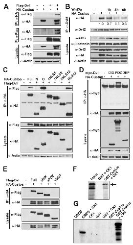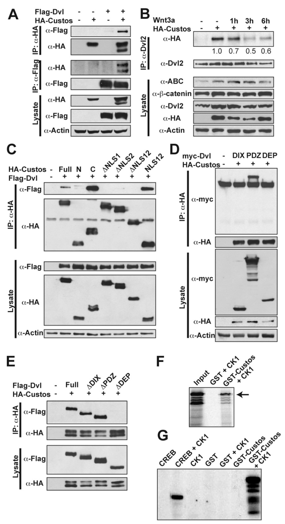 with the indicated antibodies. (D and E) The Custos binding region on Dvl2 mapped to between PDZ and DEP domain of Dvl2. HA-Custos and myc-tagged or Flag-tagged mutants of Dvl2 were transfected into HEK-293T cells and subjected to immunoprecipitation assays. (F) Custos interacts with casein kinase 1 (CK1).