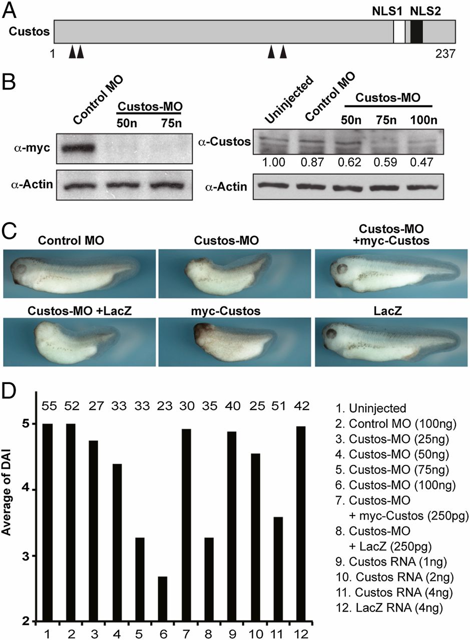 Fig. 1. Custos is required for anterior development. (A) Schematic representation of Custos and its domains. Arrowheads indicate the two clusters of dual CKI phosphorylation sites. (B) Custos-MO blocks translation of tagged-Custos protein and depletes endogenous Xenopus Custos protein levels. Myc-tagged Custos RNA containing the MO binding site was coinjected with control MO or Custos-MO, and tagged-protein was visualized by SDS/PAGE and Western blotting (Left). Endogenous Custos protein was assessed using anti-Custos antibody (Right). (C) Depletion and overexpression of Custos induce anterior head defects. The indicated RNA or MO was injected into the two dorsal blastomeres of 4-cell embryos. (D) Suppression of head development was scored by the dorso-anterior index (DAI). The numbers above each bar indicate the number of injected embryos.