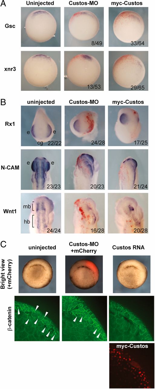 Fig. 2. Dysregulation of Custos inhibits the canonical Wnt pathway. (A and B) Overexpression or depletion of Custos reduced organizer gene expression (A) and anterior markers (B). Custos RNA (1.5 ng) or Custos-MO (50 ng) was injected with LacZ (250 pg) RNA into one dorsal cell of four-cell embryos. At stage 10.5, the expression level of organizer genes Xnr3 and Goosecoid (Gsc), or at stage 26, the expression of anterior markers Rx1, N-CAM and Wnt1, was examined by in situ hybridization. Red staining indicates the injected side. The number of embryos scored is shown on each panel. (C) Custos regulates nuclear accumulation of β-catenin at stage 10.5. Custos-MO (50 ng) or myc-Custos RNA (1 ng) was injected into one dorsal blastomere of four-cell embryos. mCherry RNA (250pg) was coinjected and red fluorescence was used as tracer for the injected side. Embryos were fixed at stage 10.5, and immunohistochemistry was performed with antiâβ-catenin and anti-myc antibodies. Arrowheads indicate cells with nuclear accumulation of β-catenin.