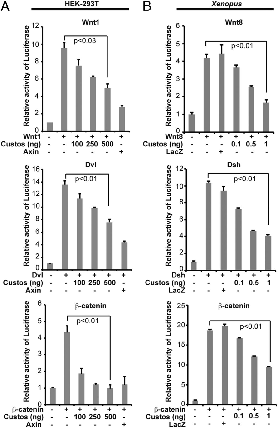 Fig. 3. Custos inhibits Wnt signal transduction. (A) Topflash reporters were cotransfected into HEK-293T cells with expression plasmids for Wnt1, Dvl or β-catenin and Custos, as indicated. (B) Topflash reporter was coinjected with Wnt8, Dsh, or β-catenin and Custos RNAs into all cells of two-cell embryos. Cell or embryo lysates (stage 10.5) were subjected to luciferase assay and normalized to reporter-only samples.