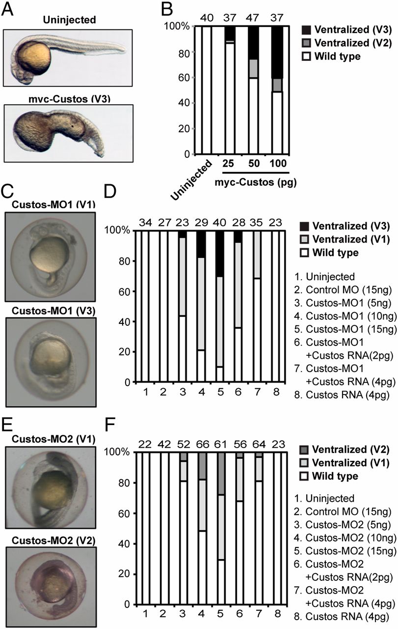 Fig. 5. Custos is required for anterior development in zebrafish. (A and B) 25â100 pg of Myc-tagged Custos RNA was injected into the one-cell embryo and scored at 28 h postfertilization (hpf) for suppression of head development by the V1âV4 index. The numbers above each bar indicate the number of injected embryos. (C and E) Injection of Custos MO1 (C) or Custos MO2 (E) suppressed head and eye development which was rescued by coinjection of Custos Rescue RNA (2â4 pg). MOs (5â15 ng) were injected at the one-cell stage and embryos were scored at 24 hpf. (D and F) Quantitation of the results in C and E, respectively. The numbers above each bar indicate the number of injected embryos.