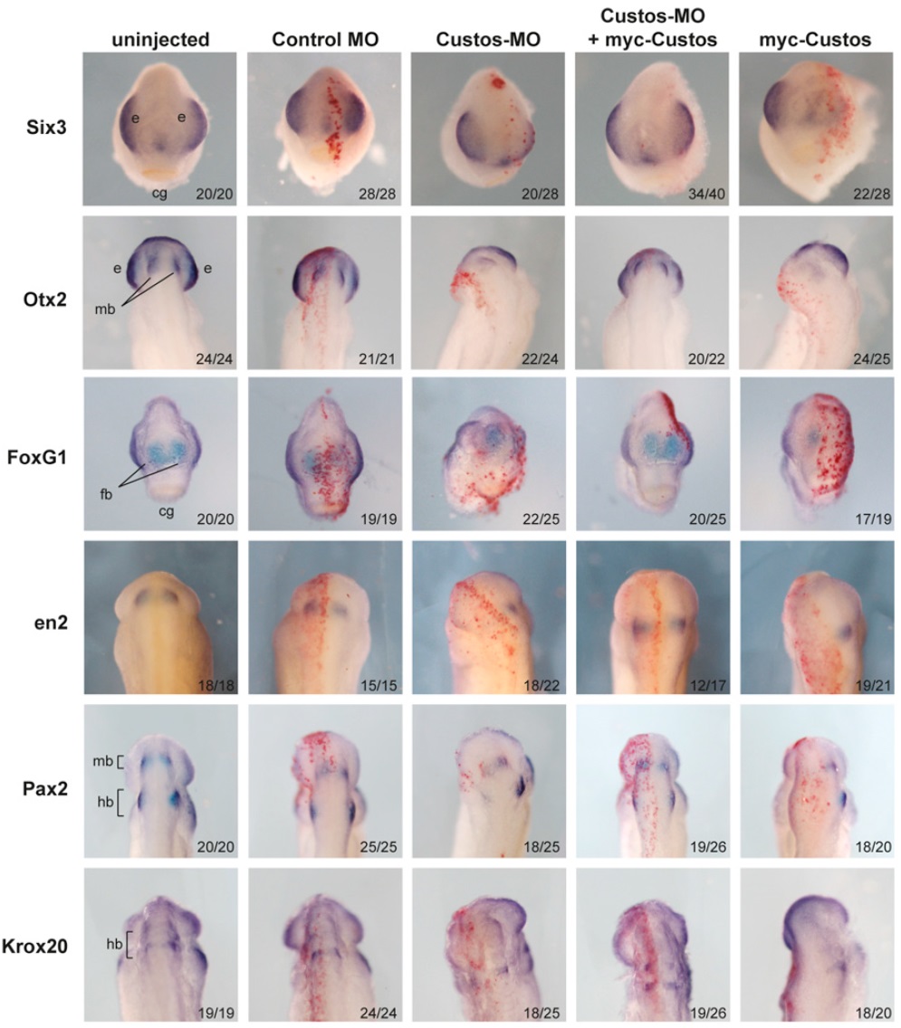 Fig. S5. Misexpression of Custos reduces the expression level of brain and eye marker genes. Custos RNA or Custos-MO was coinjected with LacZ RNA into one