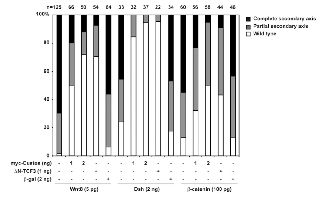 Fig. S6. Overexpression of Custos inhibits secondary axis induction by positive components of canonical Wnt signaling. Indicated RNAs along with doses were