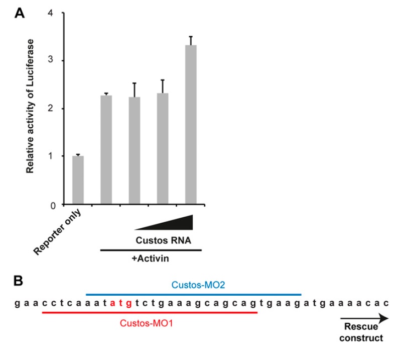 Fig. S7. (A) Custos expression does not affect Activin-mediated reporter activity. Embryos were injected with Activin-response element containing reporter
