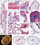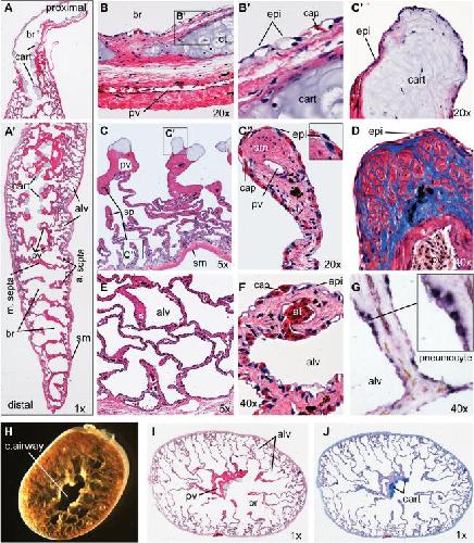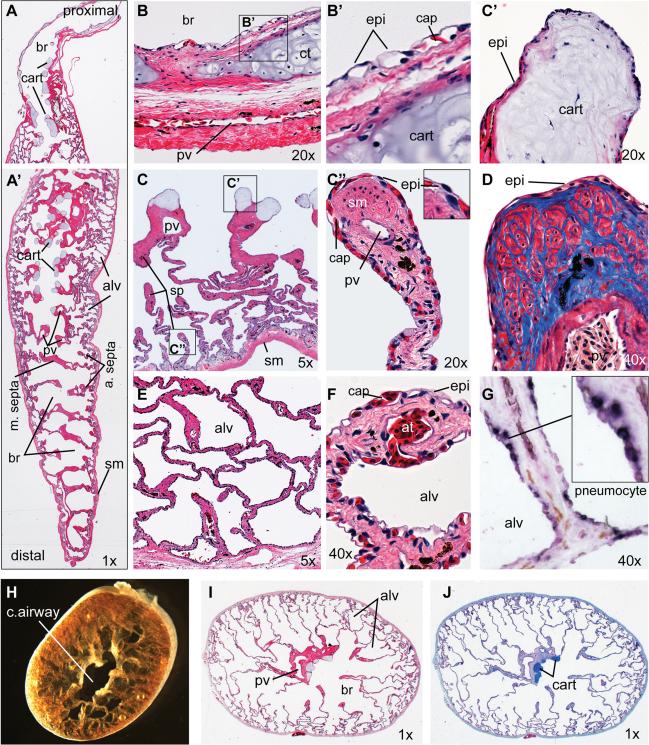 Figure 2. Histology of the adult Xenopus laevis lung. AâG: Longitudinal sections of an adult Xenopus laevis lung including (A) the proximal and (Aâ²) distal regions. B: 20à view of proximal main bronchi showing the epithelial lining and bronchi walls with cartilage plate surrounded by layers of smooth muscle and connective tissue containing a major blood vessel. Bâ²: Detail view of boxed area in (B) showing the epithelial cells in close apposition to capillaries. C: 5à view of the proximal lung showing major septa containing a pulmonary vein and terminal cartilage nodules with smaller septa forming alveoli. Câ²: 20à view of a cartilage nodule at the end of the major septa. Câ²: 20à view showing the tip of an alveolar septa. D: 40à view of an alveolar septa tip stained with Mason's Trichrome showing collagen fibers (blue) and muscle fibers (red). E: 5à view of smaller alveoli at the lung periphery. F: 40à view of the bloodâair interface in the small alveolar walls. G: In situ hybridization of sftpc (dark purple staining) showing expression in epithelial pneumocytes. H: Brightfield of the adult Xenopus lung (distal portion) cut in a transverse plane immediately after dissection. I,J: Hematoxylin/eosin-stained (I) and (J) Alcian blue-stained transverse sections Abbreviations: alv, alveolar space; at, arteriole; br, bronchiolar space; cap, capillary; cart, cartilage; epi, epithelial cell; pv, pulmonary vein; sm, smooth muscle; sp, septae.Download figure to PowerPoint