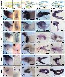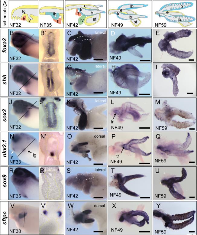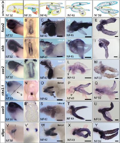Figure 3. Molecular characterization of the developing Xenopus foregut and respiratory epithelium. A: Schematic of the developing foregut region and respiratory system at the indicated developmental stages, with endoderm in yellow, heart (h) in orange, and respiratory epithelium in blue. BâY: Whole-mount in situ hybridization with the indicated probes to whole embryos at NF32 (B,F,J), NF33 (N), NF35 (R), NF38 (V) or to isolated guts at NF42 (C,G,K,O,S,W) or to lung/tracheal/esophageal regions dissected at NF49 (D,H,L,P,T,X) or NF59 (E,I,M,Q,U,Y). Abbreviations: e, esophagus; fg, foregut; h, heart; lb, lung bud; lg, lung; lv, liver; st, stomach; tr, trachea; ty, thyroid. Scale barâ=â0.5 mmDownload figure to PowerPoint