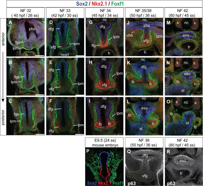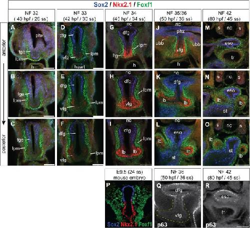 Figure 4. Immunofluorescence analysis of DâV foregut patterning and trachea-esophagus separation in Xenopus. AâO: Confocal immunostaining of the Xenopus foregut showing transverse sections at three positions along the anteriorâposterior axis at the indicated stages showing protein expression of Sox2 (blue), Nkx2.1 (red), and FoxF1 (green). P: Transverse section through the E9.5 mouse foregut showing similar expression of Sox2 (blue) Nkx2.1 (red) and FoxF1 (green). Q,R: Transverse sections of the Xenopus foregut at NF36 and NF42 showing P63 expression (white) in the dorsal foregut (Q) and esophagus (R). Abbreviations: dfg, dorsal foregut; eso, esophagus; fge, foregut epithelium; h, heart; lb, lung bud; lpm, lateral plate mesoderm; nc, notochord; s, somite; st, stomach; tr, trachea; ubb, ultimobrachial body; vfg, ventral foregut. Scale barâ=â0.1 mm.Download figure to PowerPoint