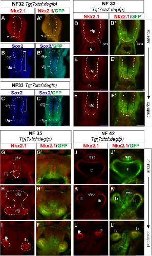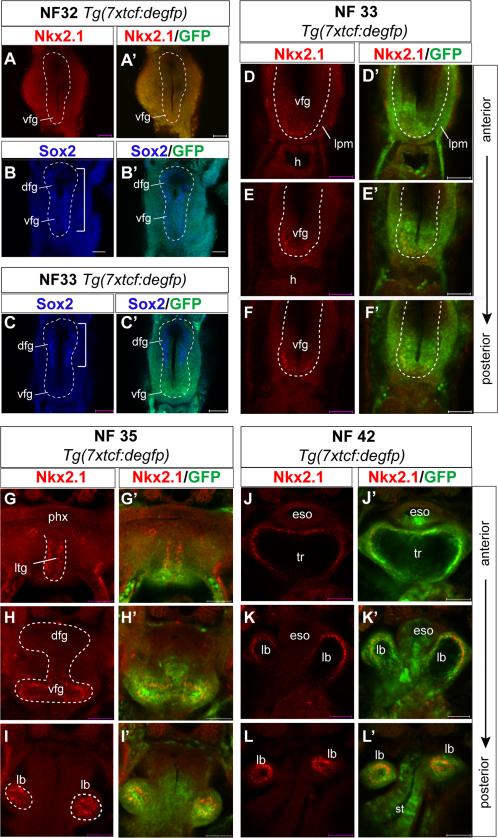 Figure 7. Activity of the canonical Wnt signaling pathway in the Xenopus foregut. AâLâ²: Confocal immunostaining of Tg(7xtcf:degfp) transgenic Xenopus tropicalis embryos, which express destabilized enhanced GFP in cell responding to Wnt/β-catenin signaling. Transverse sections show protein expression of Nkx2.1 (red) or Sox2 (blue) and eGFP (green) in the foregut at NF32 (AâBâ²), NF33 (CâE), NF35 (GâI), and NF42 (JâL). EGFP expression is first detected in the ventral foregut at NF32 before Nkx2.1 (Aâ²). By NF33 Nkx2.1 is activated and the Sox2 expression domain (white bracket) becomes down regulated (BâCâ²) in the EGFP expressing ventral endoderm. Abbreviations: dfg, dorsal foregut endoderm; eso, esophagus; lb, lung bud; lpm, lateral plate mesoderm; ltg, laryngo-tracheal grove; st, stomach; tr, trachea; vfg, ventral foregut endoderm. Scale barâ=â0.1 mm.Download figure to PowerPoint