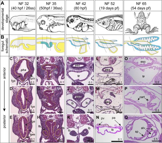 Figure 1. Histology of the developing Xenopus laevis foregut and respiratory system. A: Xenopus laevis embryos images at different developmental stages from Nieuwkoop and Faber (1994). B: Schematic illustrations of the foregut region of the embryo at the indicated developmental stages. Endoderm is yellow and respiratory endoderm is blue. CâQ: Hematoxylin/eosin stained sections of the developing foregut / respiratory system / lungs at the indicated stages; plane of section is indicated in (B) and endoderm is outlined by dashed yellow line in CâH. Abbreviations: alv, alveolar sac; cart, cartilage; eso, esophagus; fge, foregut endoderm; h, heart; lb, lung bud; lpm, lateral plate mesosderm; ltg, laryngo-tracheal groove nc, notochord; pa, pulmonary artery; phx, pharynx; pv, pulmonary vein; sp, septae; tr, trachea. Scale barâ=â0.1 mm or 0.5 mm as indicated.Download figure to PowerPoint