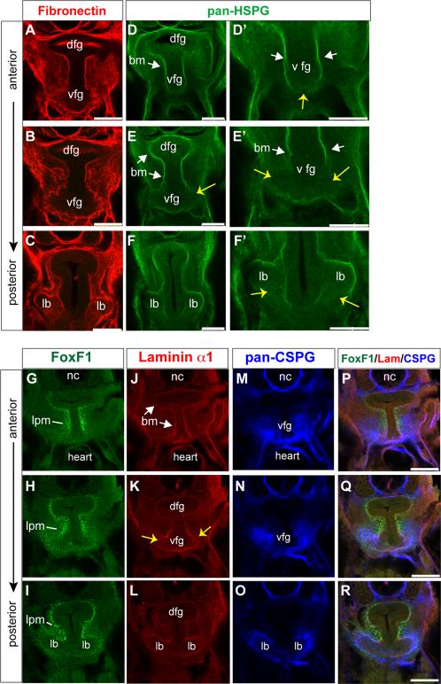 Figure 5. Immunofluorescence analysis of the extracellular matrix and basement membrane surrounding the Xenopus foregut and lung buds. AâR: Confocal immunostaining of transverse sections through the NF35 Xenopus foregut at three positions along the anteriorâposterior axis showing protein expression of (AâC) Fibronectin, (DâFâ²) Heparin sulfate proteoglycans, (GâI) FoxF1, (JâL) Laminin alpha-1, and (MâO) Chondroitin sulfate proteoglycans. Abbreviations: bm, basement membrane; dfg, dorsal foregut; lb, lung bud; lpm, lateral plate mesoderm; vfg, ventral foregut. Scale barâ=â0.1 mm.Download figure to PowerPoint