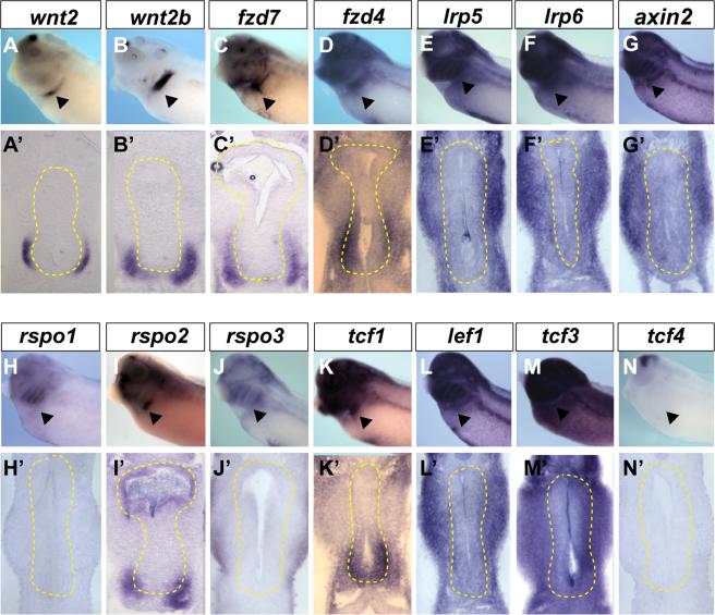 Figure 6. Expression of Wnt pathway components in the Xenopus foregut. AâN: In situ hybridization using indicated probes to NF34/35 embryos. Aâ²âNâ²: Vibratome sections through the foregut with endoderm outlined by the yellow dashed line. The arrowhead indicates the presumptive lung region.Download figure to PowerPoint