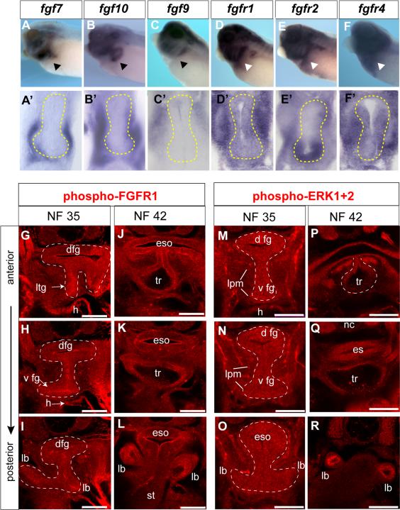 Figure 8. Expression of FGF pathway components in the Xenopus foregut. AâF: In situ hybridization using indicated probes to NF34/35 embryos. Aâ²âFâ²: vibratome sections through the foregut with endoderm outlined by the yellow dashed line. GâR: Confocal immunostaining of phosphorylated FGFR1 (GâL) and phosphorylated ERK1/2 (MâR) in the foregut at the indicated stages. Abbreviations: dfg, dorsal foregut; eso, esophagus; h, heart; lb, lung bud; lpm, lateral plate mesoderm; ltg, laryngo-tracheal groove; st, stomach; tr, trachea.Download figure to PowerPoint