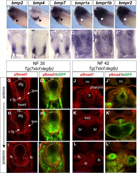 Figure 9. Expression of BMP pathways components in the Xenopus foregut. AâF: In situ hybridization using indicated probes to NF34/35 embryos. Aâ²âFâ²: Vibratome sections through the foregut with endoderm outlined by the yellow dashed line. GâLâ²: Confocal immunostaining of pSmad1 (red) and eGFP (green) in the foregut of Tg(7xtcf:degfp) transgenic Xenopus tropicalis embryos at NF35 (GâI) and NF42 (JâL). Abbreviations: br, primary bronchi; dfg, dorsal foregut endoderm; eso, esophagus; lb, lung bud; lpm, lateral plate mesoderm; ltg, laryngo-tracheal grove; st, stomach; tr, trachea; vfg, ventral foregut endoderm.Download figure to PowerPoint