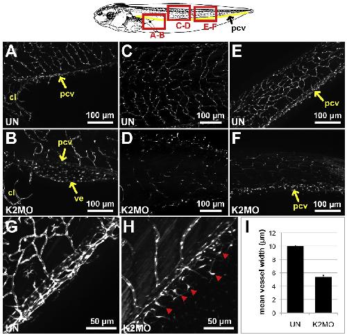 disrupted in K2MO morphants. (GâH) A magnified view of paired pcvs showing that in K2MO morphants, endothelial cells