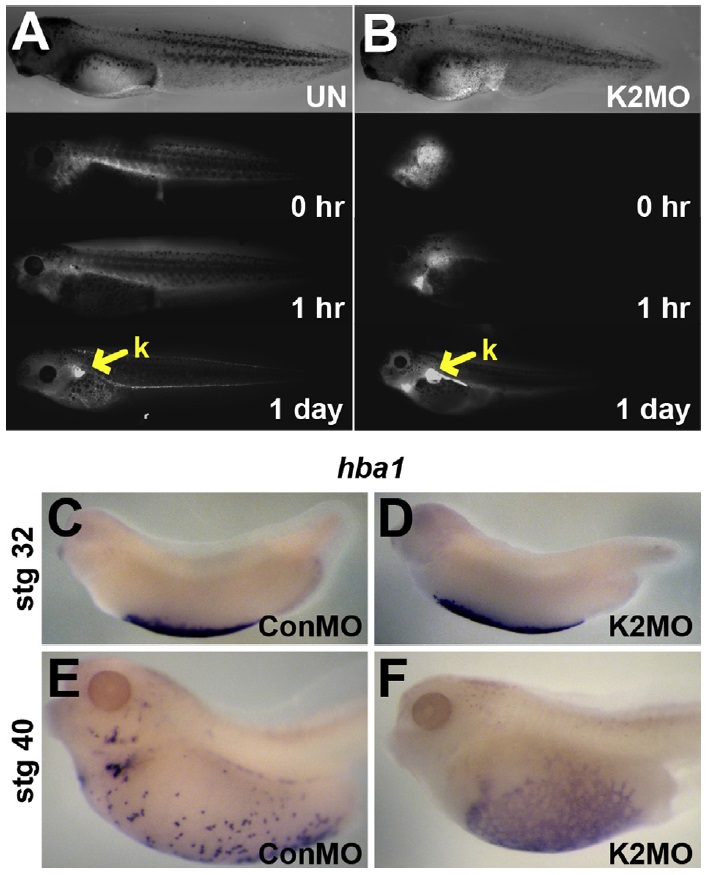 evident in the K2MO morphant. (FâG) RNA in situ hybridization using hba1 as a blood marker confirmed presence of blood