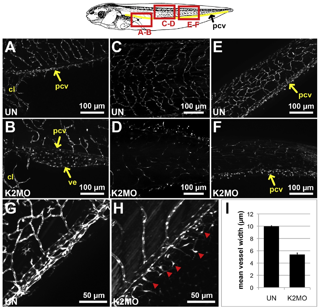 uninjected compared to K2MO injected embryos; blood vessels widths observed in K2MO morphants were narrower than