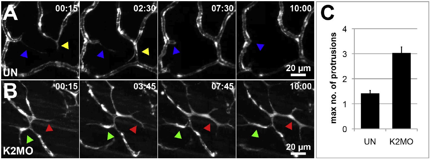 uninjected and K2MO injected embryos over 10 h. Each colored arrowhead points to a particular endothelial cell. The yellow
